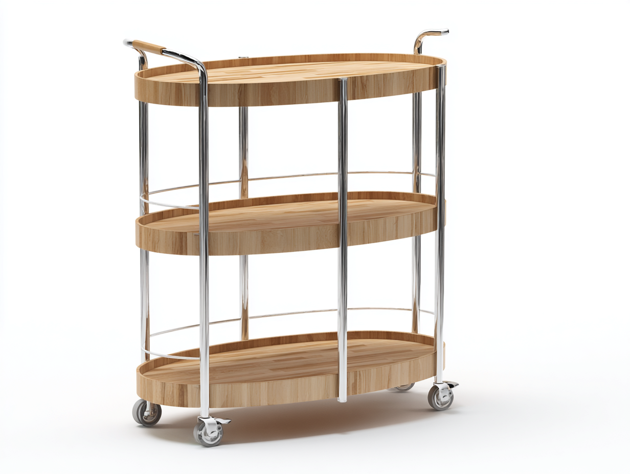 El carrito está fabricado con bandejas de madera en tono natural que aportan un aspecto cálido y decorativo. La estructura metálica en acabado plateado proporciona estabilidad y resistencia, garantizando un uso cómodo y duradero.