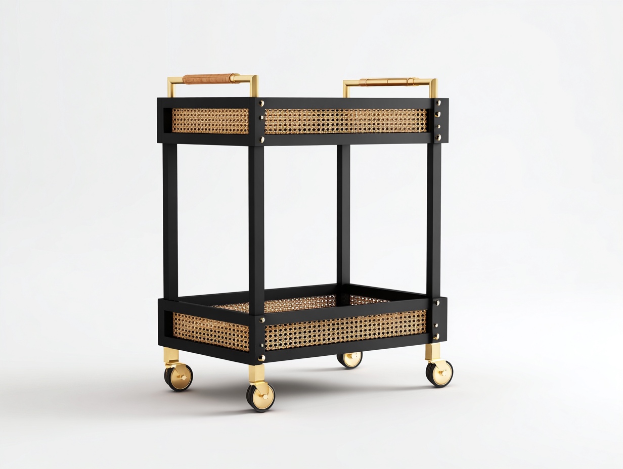 El carrito está fabricado con una estructura metálica robusta en acabado negro combinada con paneles de ratán trenzado en tono natural. Los detalles en acabado dorado refuerzan su estética elegante y aportan un contraste sofisticado que resalta su diseño contemporáneo.