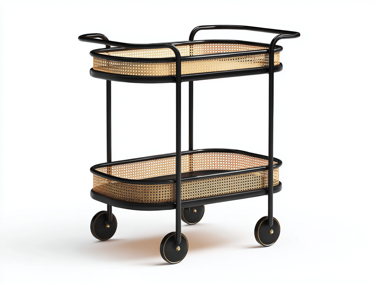 El carrito está fabricado con una estructura metálica resistente en color negro combinada con paneles de ratán trenzado en tono natural que aportan textura y un aspecto sofisticado. La combinación de materiales ofrece un equilibrio entre estilo moderno y estética natural.