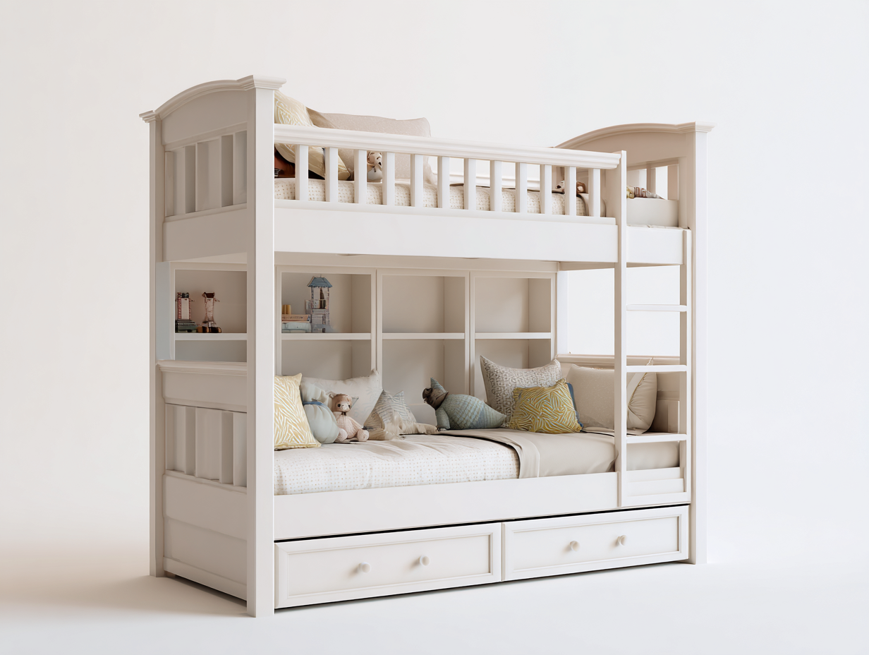 El diseño vertical permite aprovechar mejor el espacio disponible en la habitación. La escalera lateral facilita el acceso a la cama superior. La estructura incluye estanterías abiertas en la zona central para colocar libros u objetos decorativos, además de cajones inferiores que ofrecen espacio adicional para organizar ropa de cama u otros artículos del dormitorio.